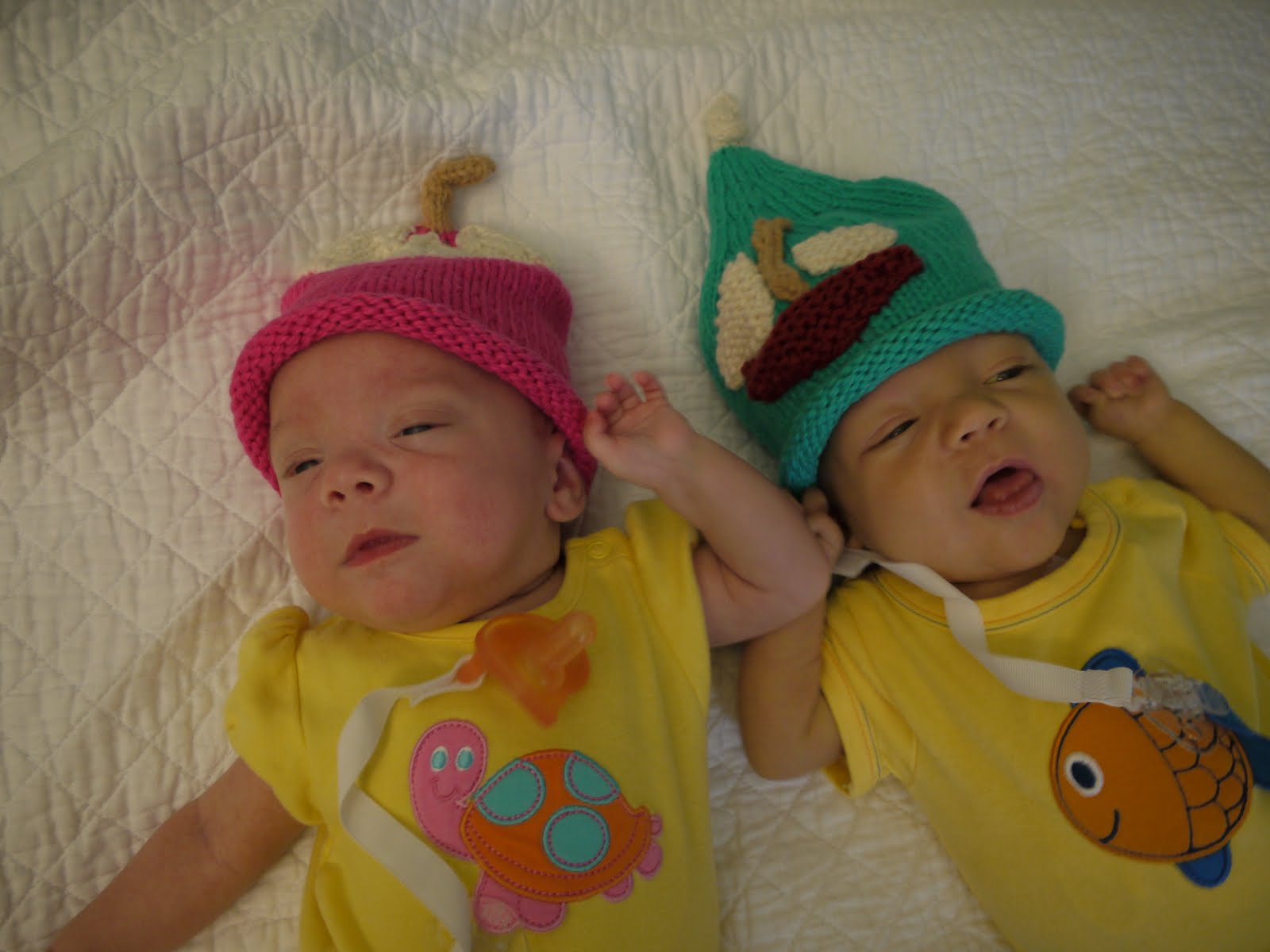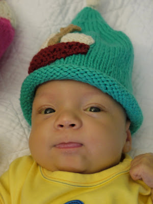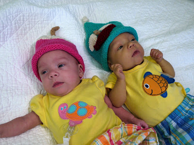 Those hats were made by a friend and co-worker of my mom, Cindy R. When she heard about the twins, she immediately set out to make a couple of hats for them just as she had their older brother. As you can see below and in this September album I've just updated, these hats are super cute too.